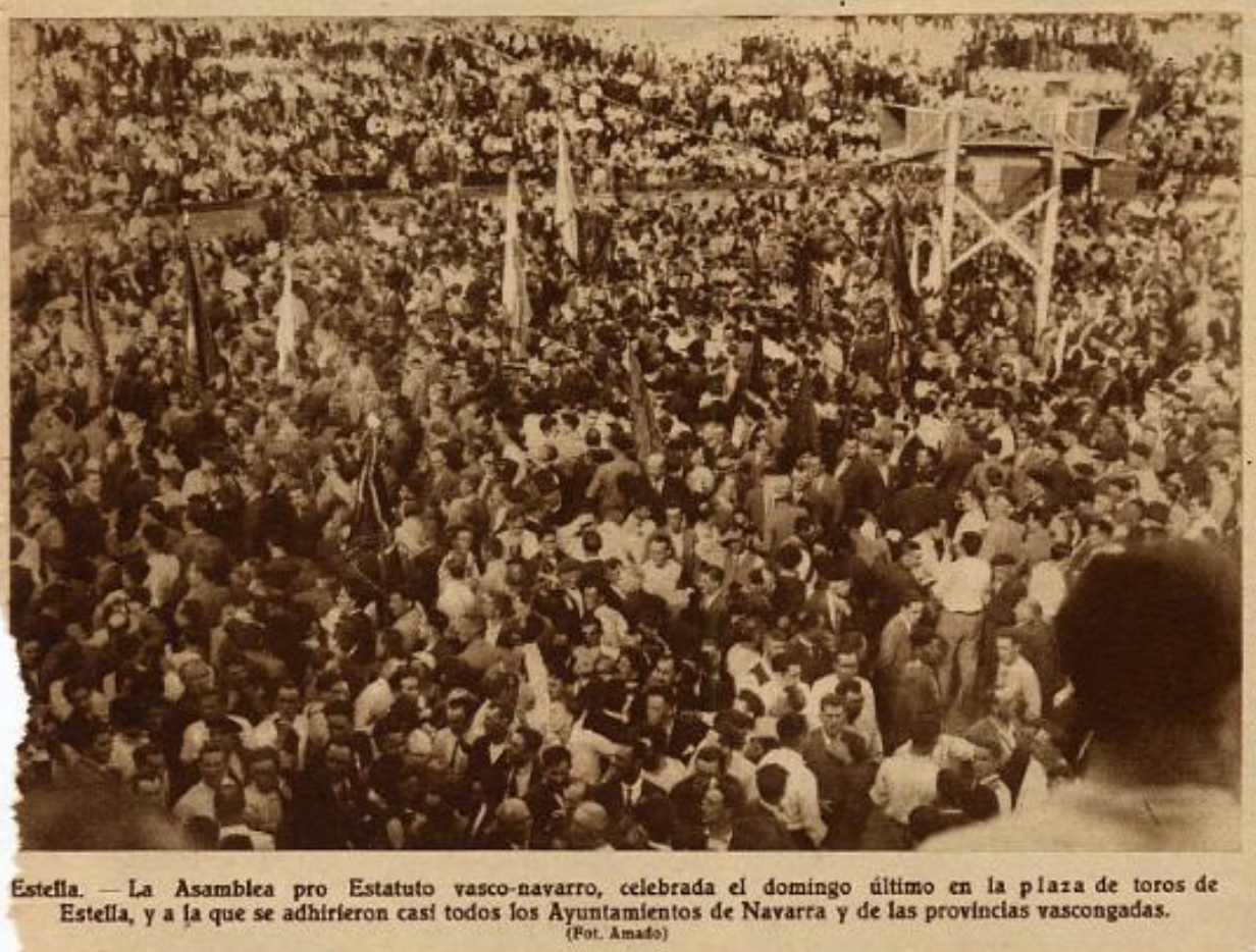 “Vista una comunicación de la alcaldía de Bilbao participando el acuerdo adoptado por aquel ayuntamiento en sesión celebrada el día de tres de los corrientes, de requerir a las Comisiones Gestoras de las Diputaciones de Alava, Guipúzcoa y Vizcaya, fuera que con urgencia presenten a la aprobación de los ayuntamientos respectivos, el Estatuto de Autonomía que vienen confeccionando, y que una vez aprobado por los ayuntamientos se señale una fecha no más lejana al día treinta de Julio próximo venidero, para llevar a cabo el referéndum previsto en disposición gubernamental, y de comunicar inmediatamente dicho acuerdo a todos los ayuntamientos de Alava, Guipúzcoa y Vizcaya, para que en igual sentido adopten acuerdos, y para que en términos semejantes requieran a las respectivas Comisiones Gestoras al cumplimiento de la promesa hecha en Pamplona de someter un proyecto de Estatuto autonómico a la aprobación de los ayuntamientos, y al referéndum de los electores, sin perjuicio de expresar el deseo de los ayuntamientos para que se consiga la aportación de la voluntad de Navarra hacia un Estatuto común de las cuatro provincias hermanas, porque la mayoría de ayuntamientos vascos así lo expresó con sus votos en Pamplona, y porque es de primordial importancia para el Pueblo Vasco la union de todos los vascos en un solo Estatuto, la corporación acuerda por unanimidad, adherirse con todo interés a los referidos acuerdos del ayuntamiento de Bilbao y recabar con todo entusiasmo el cumplimiento por parte de la Comisión Gestora de nuestra diputación provincial, de todo lo que en dichos acuerdos se refleja a la mayor brevedad.”