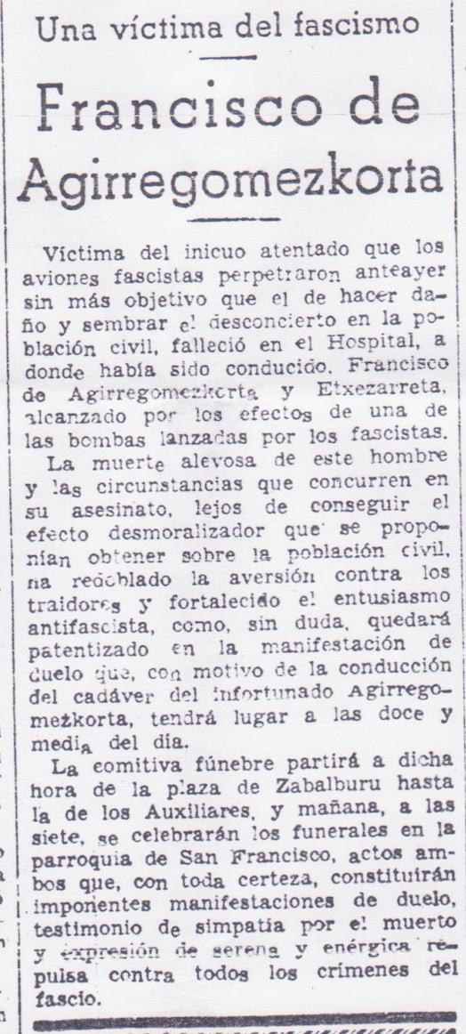 Víctima del inicio atentado que los aviones fascistas perpetraron anteayer sin más objetivo que el de hacer daño y sembrar el desconcierto en la población civil, falleció en el hospital a donde había sido conducido, Francisco de Agirregomezkorta y Etxezarreta alcanzado por los efectos de una de las bombas lanzadas por los fascistas.